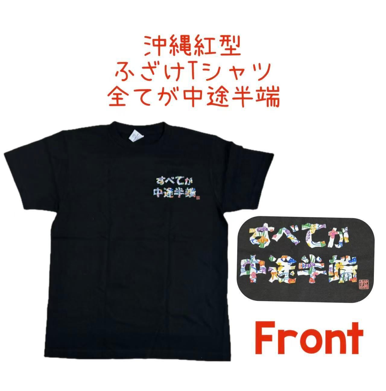 沖縄島日和 【すべてが中途半端 今日も途中であきらめた】黒Tシャツ ふざけ おもしろ 紅型 文字Tシャツ