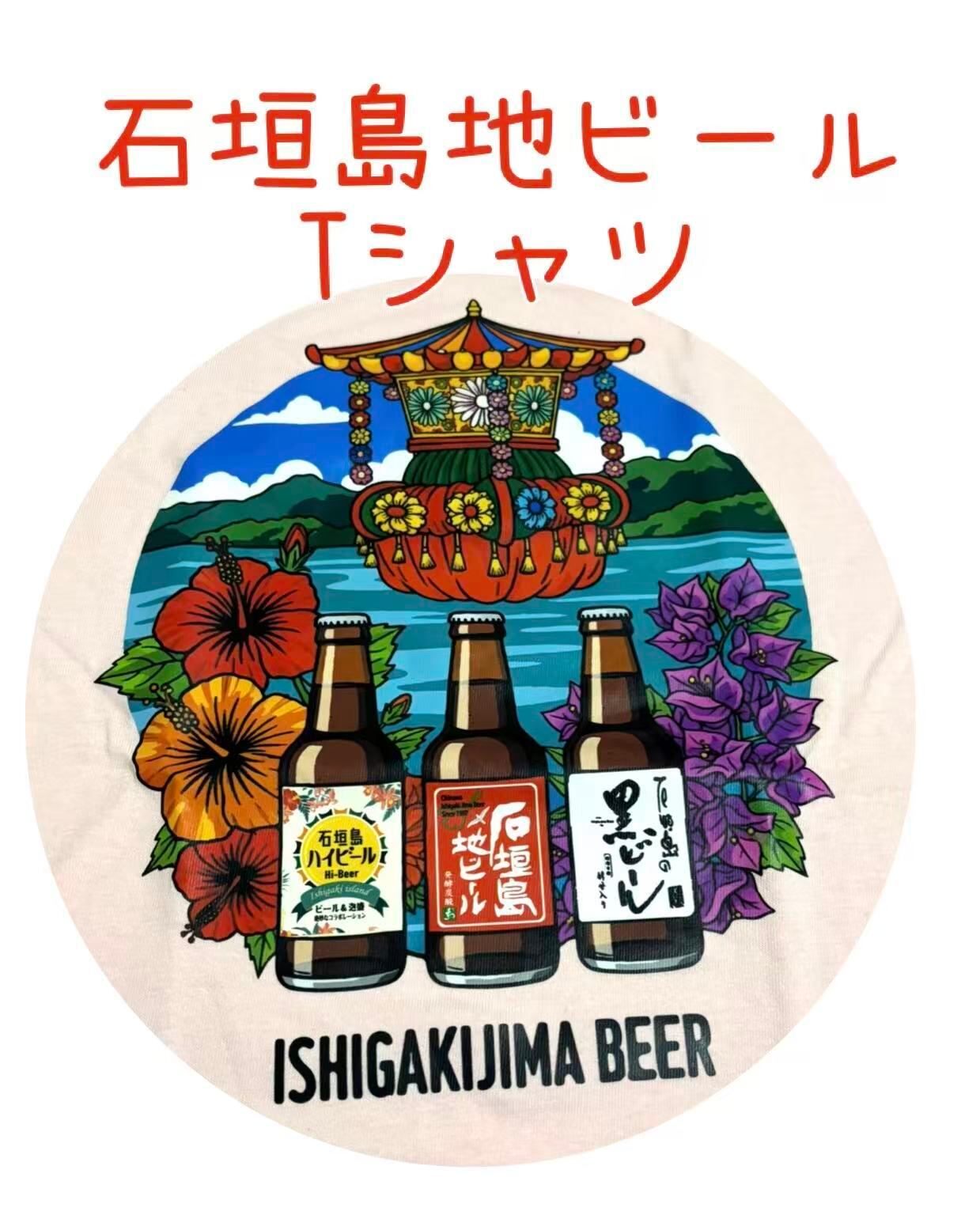 かっこかわいいデザインのと石垣島ビール3種類の瓶ビール瓶とハイビスカスのシンプルで沖縄らしいデザインTシャツ